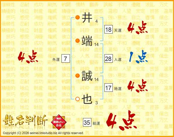 井(4画)端(14画) 誠(14画)也(3画)