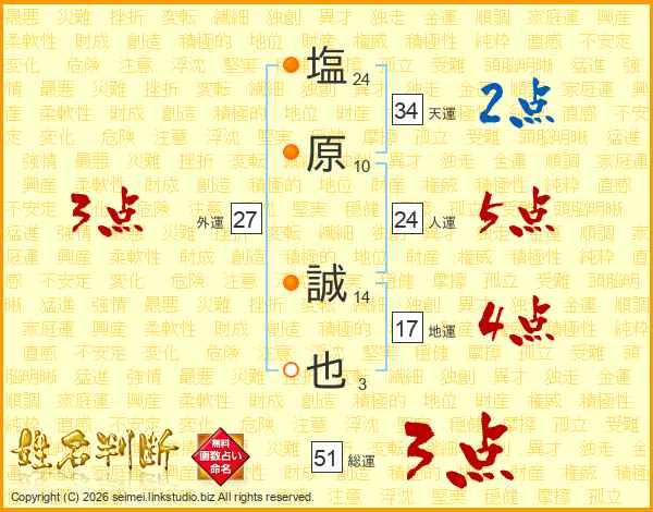 塩原誠也さんの人運は24画の5点!