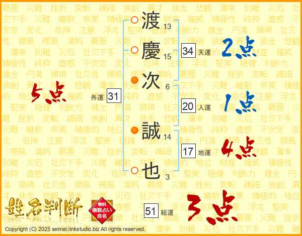 渡(13画)慶(15画)次(6画) 誠(14画)也(3画)