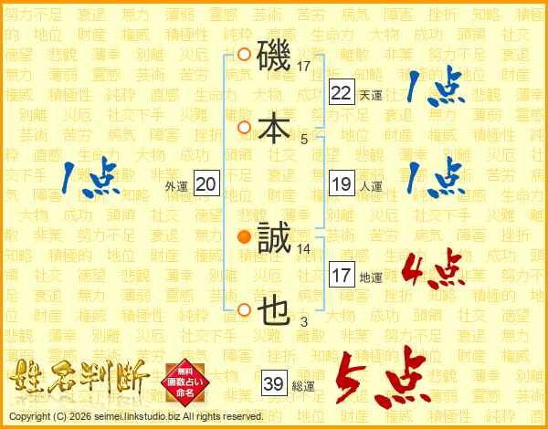 磯本誠也さんの総運は39画の5点!