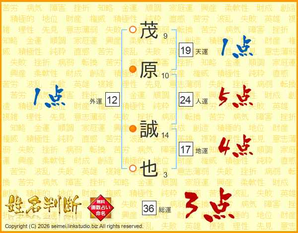 生活面を象徴する運勢です。外部から受ける影響力を表し、結婚運、家庭運や職場、環境への順応性を表します。総運から人運を引いた画数。姓や名が1文字の場合を除く。