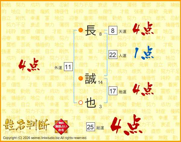 あなたの人生を表す1番重要な運勢です。生涯を通じて影響する総合運となり、主に50歳以降の晩年期に影響を及ぼします。苗字と名前の合計画数。