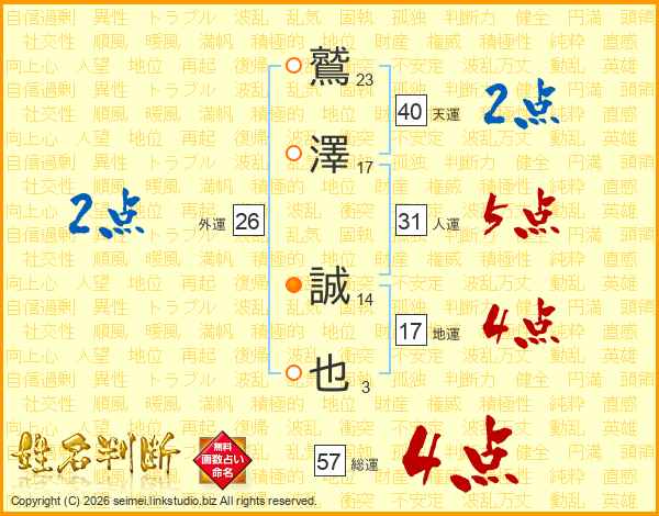 鷲澤誠也さんの総運は57画の4点!