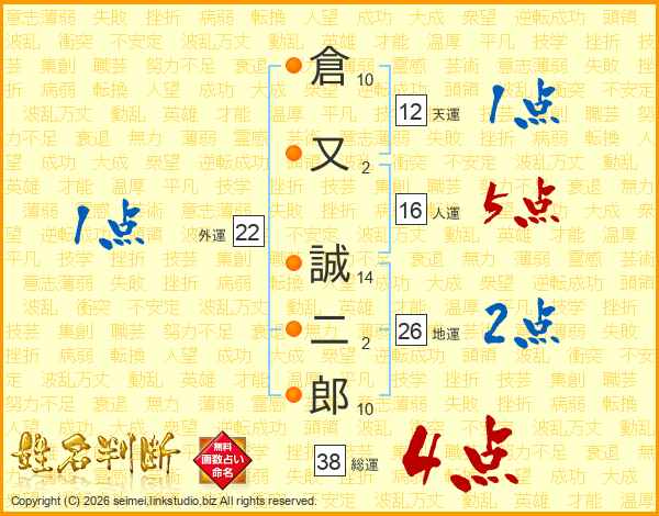 倉(10画)又(2画) 誠(14画)二(2画)郎(10画)