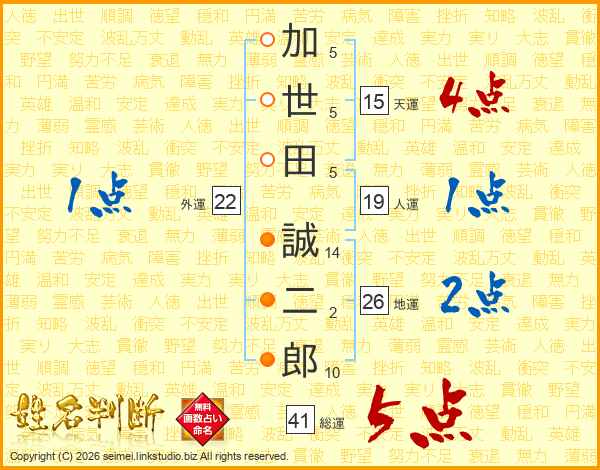 加(5画)世(5画)田(5画) 誠(14画)二(2画)郎(10画)