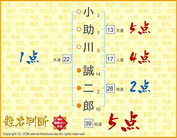 小(3画)助(7画)川(3画) 誠(14画)二(2画)郎(10画)