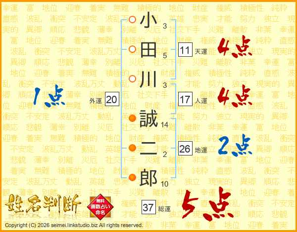 小(3画)田(5画)川(3画) 誠(14画)二(2画)郎(10画)