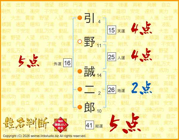 引(4画)野(11画) 誠(14画)二(2画)郎(10画)