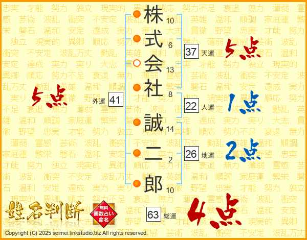 株(10画)式(6画)会(13画)社(8画) 誠(14画)二(2画)郎(10画)