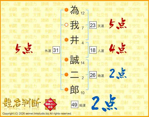 為我井誠二郎さんの天運は23画の5点!