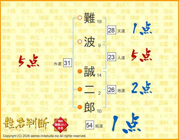難(19画)波(9画) 誠(14画)二(2画)郎(10画)