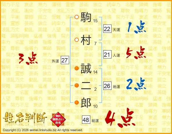 駒(15画)村(7画) 誠(14画)二(2画)郎(10画)
