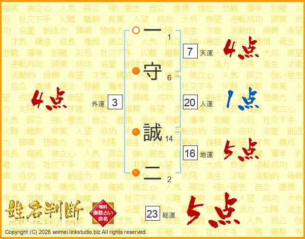 一守誠二さんの総運は23画の5点!