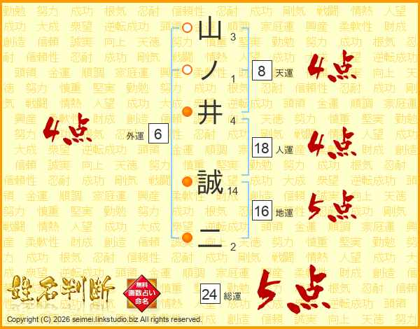 山(3画)ノ(1画)井(4画) 誠(14画)二(2画)