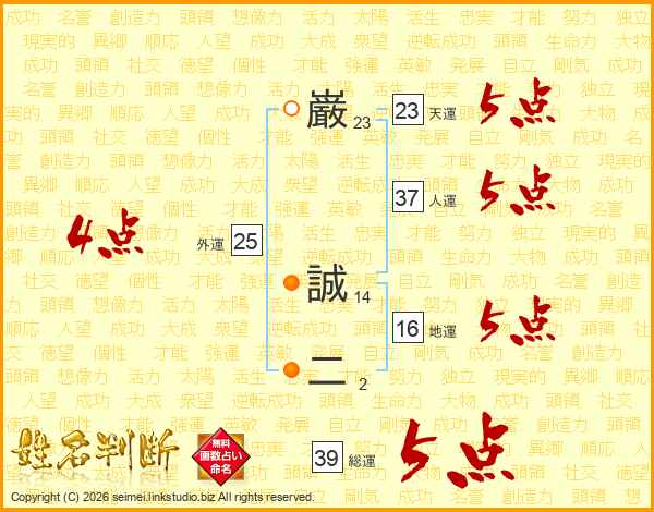 家系が持つ宿命的な運勢を表します。祖先から受け継いだ苗字ですので自分の力が及びません。家柄を象徴します。苗字の合計画数。