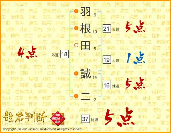 羽(6画)根(10画)田(5画) 誠(14画)二(2画)