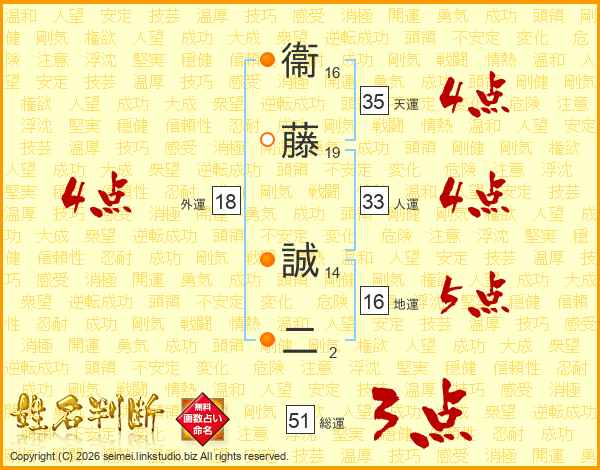 衞(16画)藤(19画) 誠(14画)二(2画)