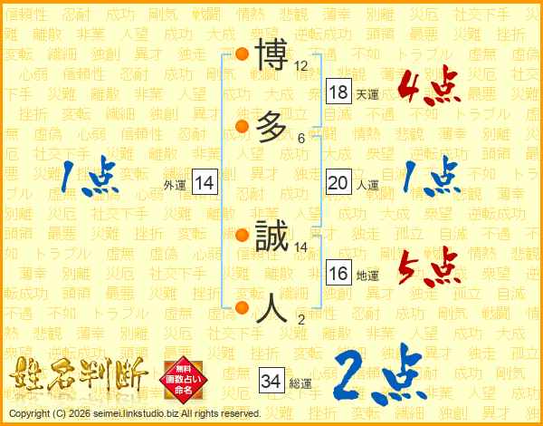 生活面を象徴する運勢です。外部から受ける影響力を表し、結婚運、家庭運や職場、環境への順応性を表します。総運から人運を引いた画数。姓や名が1文字の場合を除く。