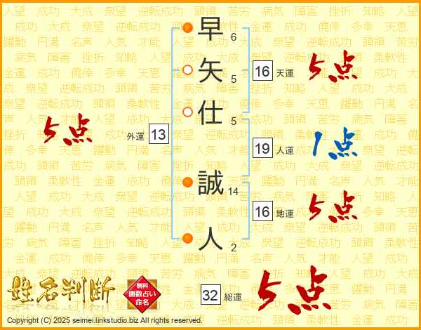 早(6画)矢(5画)仕(5画) 誠(14画)人(2画)