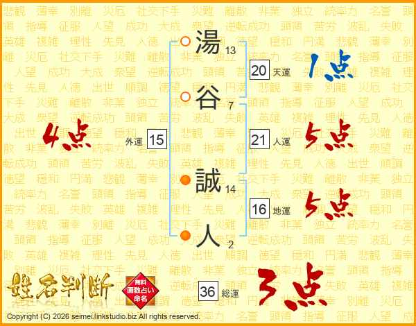 湯(13画)谷(7画) 誠(14画)人(2画)