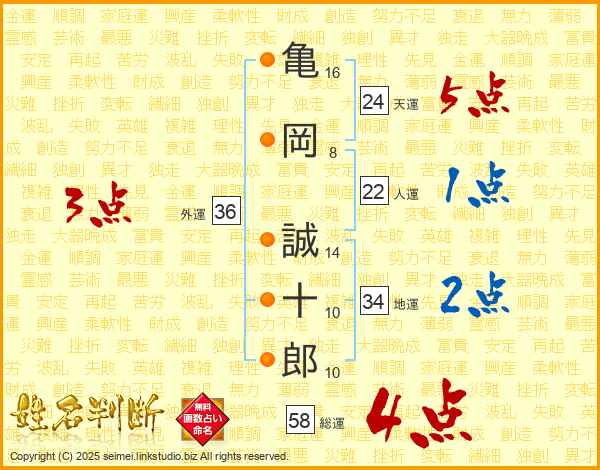 亀岡誠十郎さんの総運は58画の4点!