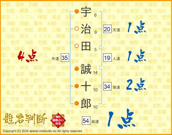 宇(6画)治(9画)田(5画) 誠(14画)十(10画)郎(10画)