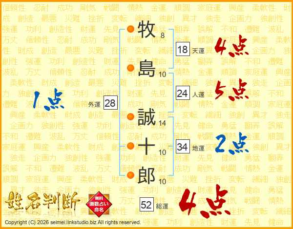 牧(8画)島(10画) 誠(14画)十(10画)郎(10画)