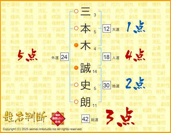 三(3画)本(5画)木(4画) 誠(14画)史(5画)朗(11画)