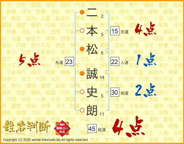 二(2画)本(5画)松(8画) 誠(14画)史(5画)朗(11画)