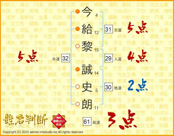 今(4画)給(12画)黎(15画) 誠(14画)史(5画)朗(11画)