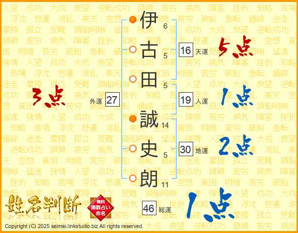 伊(6画)古(5画)田(5画) 誠(14画)史(5画)朗(11画)