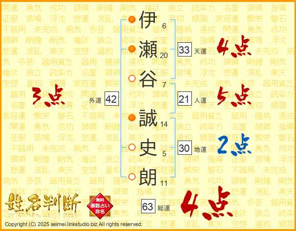 伊瀬谷誠史朗さんの総運は63画の4点!