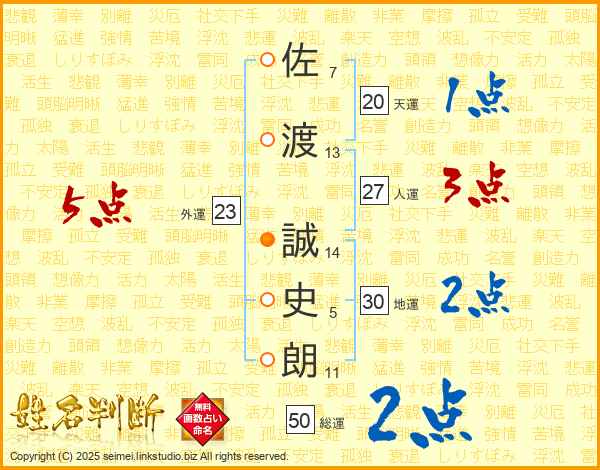 佐(7画)渡(13画) 誠(14画)史(5画)朗(11画)
