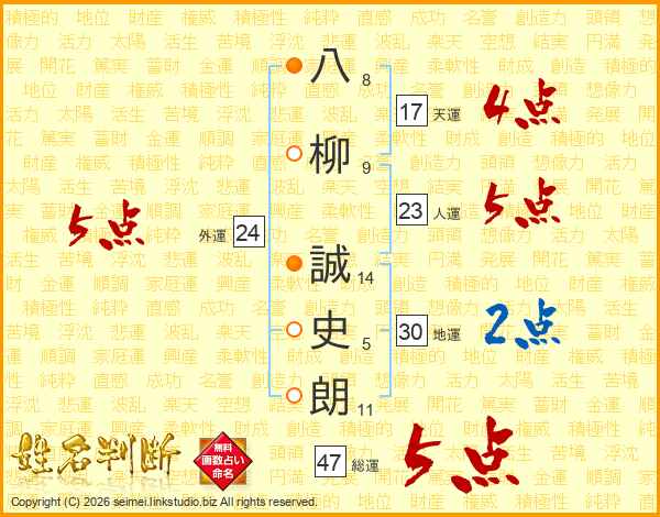 八柳誠史朗さんの人運は23画の5点!