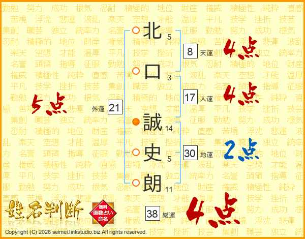 北(5画)口(3画) 誠(14画)史(5画)朗(11画)