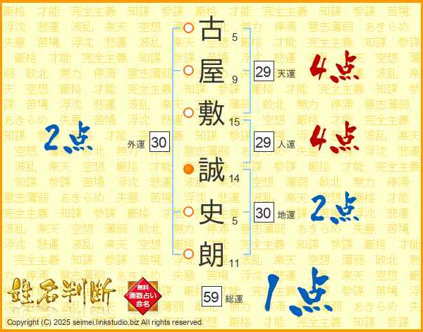 古(5画)屋(9画)敷(15画) 誠(14画)史(5画)朗(11画)