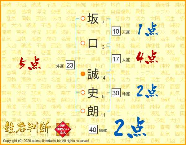 坂(7画)口(3画) 誠(14画)史(5画)朗(11画)