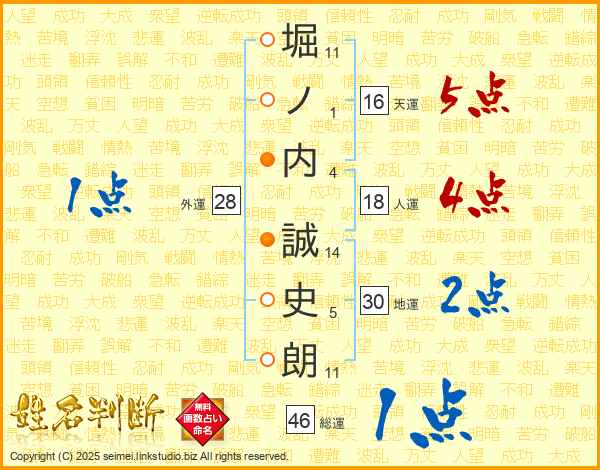 堀(11画)ノ(1画)内(4画) 誠(14画)史(5画)朗(11画)