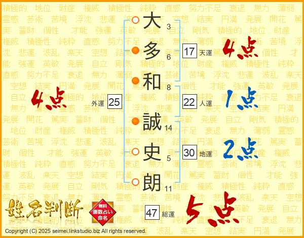 大(3画)多(6画)和(8画) 誠(14画)史(5画)朗(11画)