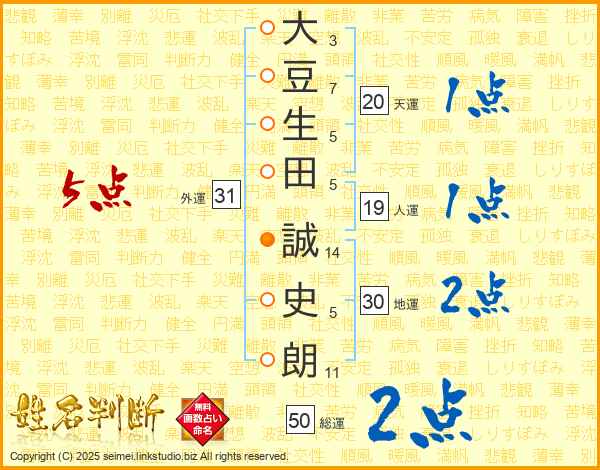 大(3画)豆(7画)生(5画)田(5画) 誠(14画)史(5画)朗(11画)