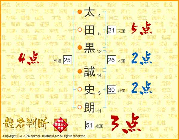 太(4画)田(5画)黒(12画) 誠(14画)史(5画)朗(11画)