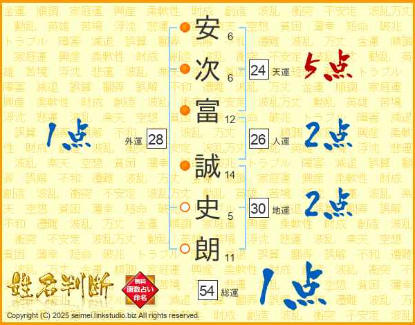 安(6画)次(6画)富(12画) 誠(14画)史(5画)朗(11画)