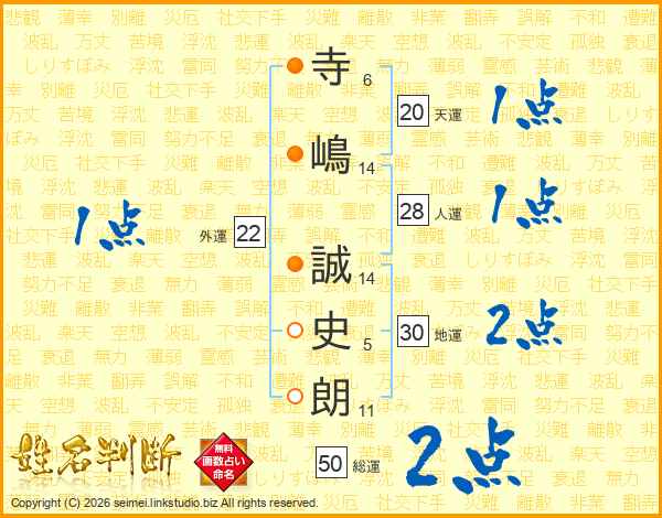 寺(6画)嶋(14画) 誠(14画)史(5画)朗(11画)