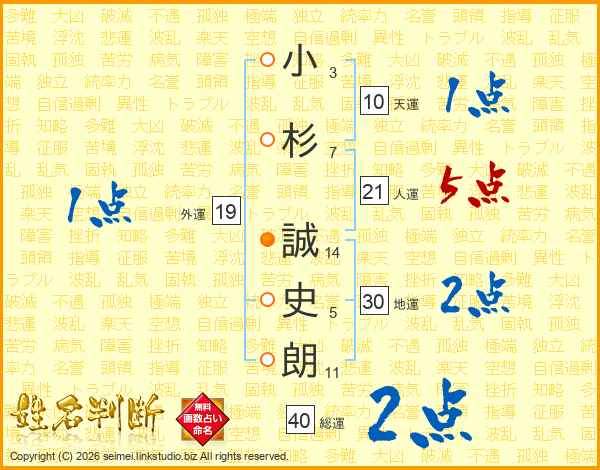 小(3画)杉(7画) 誠(14画)史(5画)朗(11画)