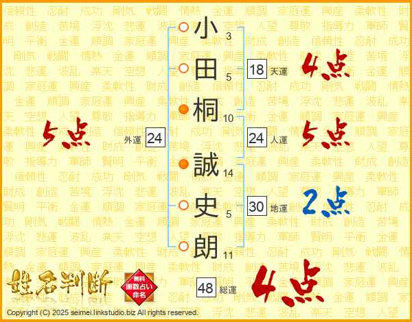 小(3画)田(5画)桐(10画) 誠(14画)史(5画)朗(11画)