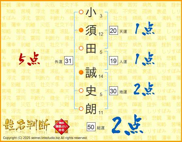 小(3画)須(12画)田(5画) 誠(14画)史(5画)朗(11画)