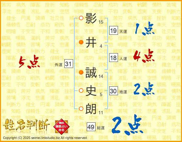影(15画)井(4画) 誠(14画)史(5画)朗(11画)