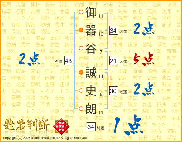 御(11画)器(16画)谷(7画) 誠(14画)史(5画)朗(11画)