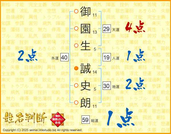 御(11画)園(13画)生(5画) 誠(14画)史(5画)朗(11画)