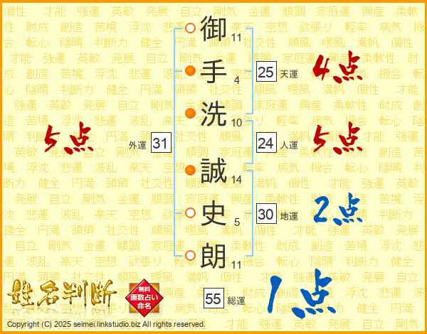 御(11画)手(4画)洗(10画) 誠(14画)史(5画)朗(11画)